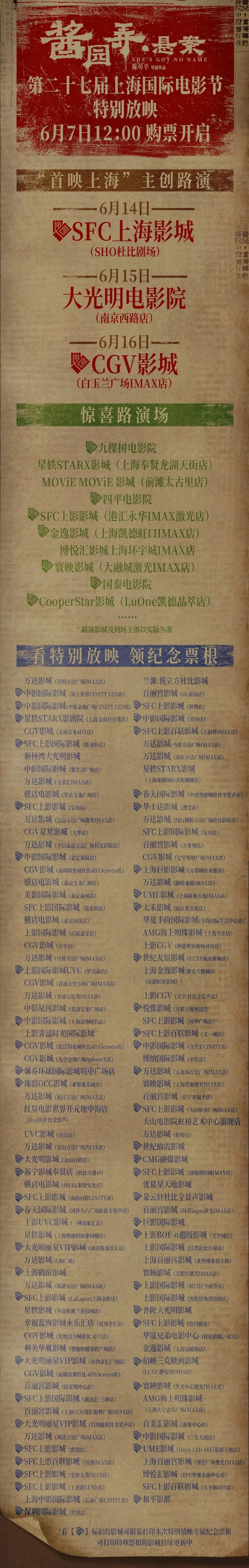 市电影局介绍,第27届上海国际电影节开幕影片《酱园弄·悬案》特别放映将于6月7日12:00正式开票。今年上海国际电影节尝试创新,首次将开幕影片进行全市范围的特别放映,场次将超过500场,普通观众能够第一时间一睹上海国际电影节开幕影片风采。更多路演活动、领取纪念票根等详见↓