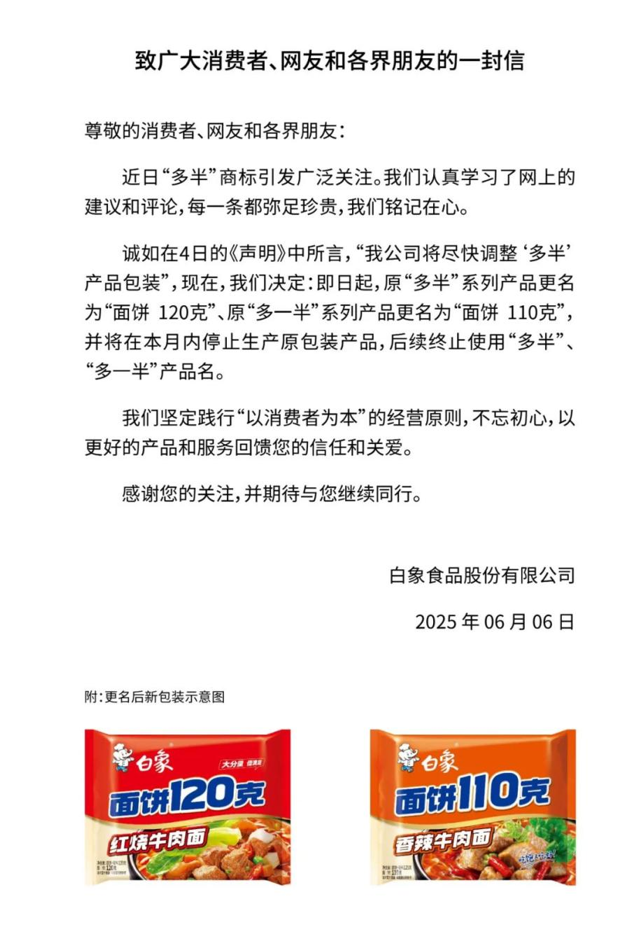 白象在公开信中称,认真学习网络上大量的建议和评论后,本着“以消费者为本”的经营原则和“至诚”的企业文化,决定即日起将原“多半”系列产品更名为“面饼120克”、原“多一半”系列产品更名为“面饼110克”,并将在本月内停止生产原包装产品,后续终止使用“多半”“多一半”产品名。