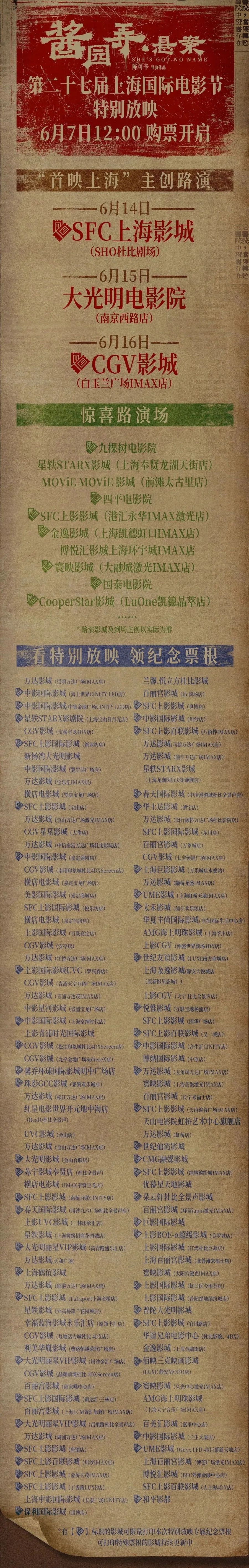 为纪念世界电影诞生130周年、中国电影诞生120周年,满足广大影迷的观影需求,6月14日当天和15、16日两天,本市将分别有120、130家影院特别放映《酱园弄·悬案》,营造“全城皆光影,人人可参与”的热烈氛围。