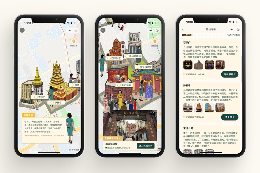 记者看到,小程序设计了8大主题探索线路,其中包括:“影史夕拾:武康路的电影修复之旅”“陆上行舟:沿苏州河探秘影像上海”“星球危机:陆家嘴拯救行动”等,涵盖丰富的路线、主题及“剧情”。用户可选择扮演特定角色,如胶片修复师、小报记者等,在精心规划的约3公里步行/骑行路线中,探访每条线路精选的6处以上电影地标,完成剧情任务,像走进“电影元宇宙”那样,深度融入城市叙事,化身“魔都故事的主演”。