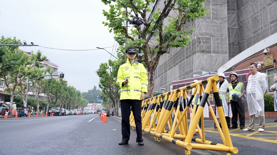 上午8时许,在复旦实验中学考点,杨浦公安分局无人机大队应用场景负责人张华伟操控警用无人机腾空而起,化身“空中哨兵”,对考点周边交通状况、人员聚集区域进行全方位、无死角巡航。实时高清画面同步回传分局情指中心,中心在精准研判后第一时间调度现场警力疏导潜在拥堵点,将隐患化解于未然,确保考生安全有序进入考场。