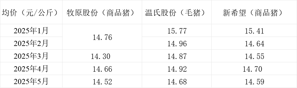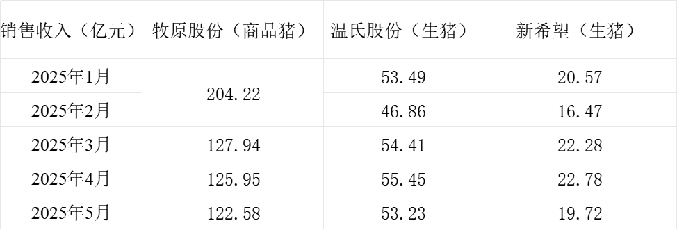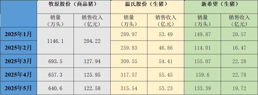 三大上市猪企牧原股份(002714.SZ)、新希望(000876.SZ)、温氏股份(300498.SZ)近日发布2025年5月生猪销售情况简报。