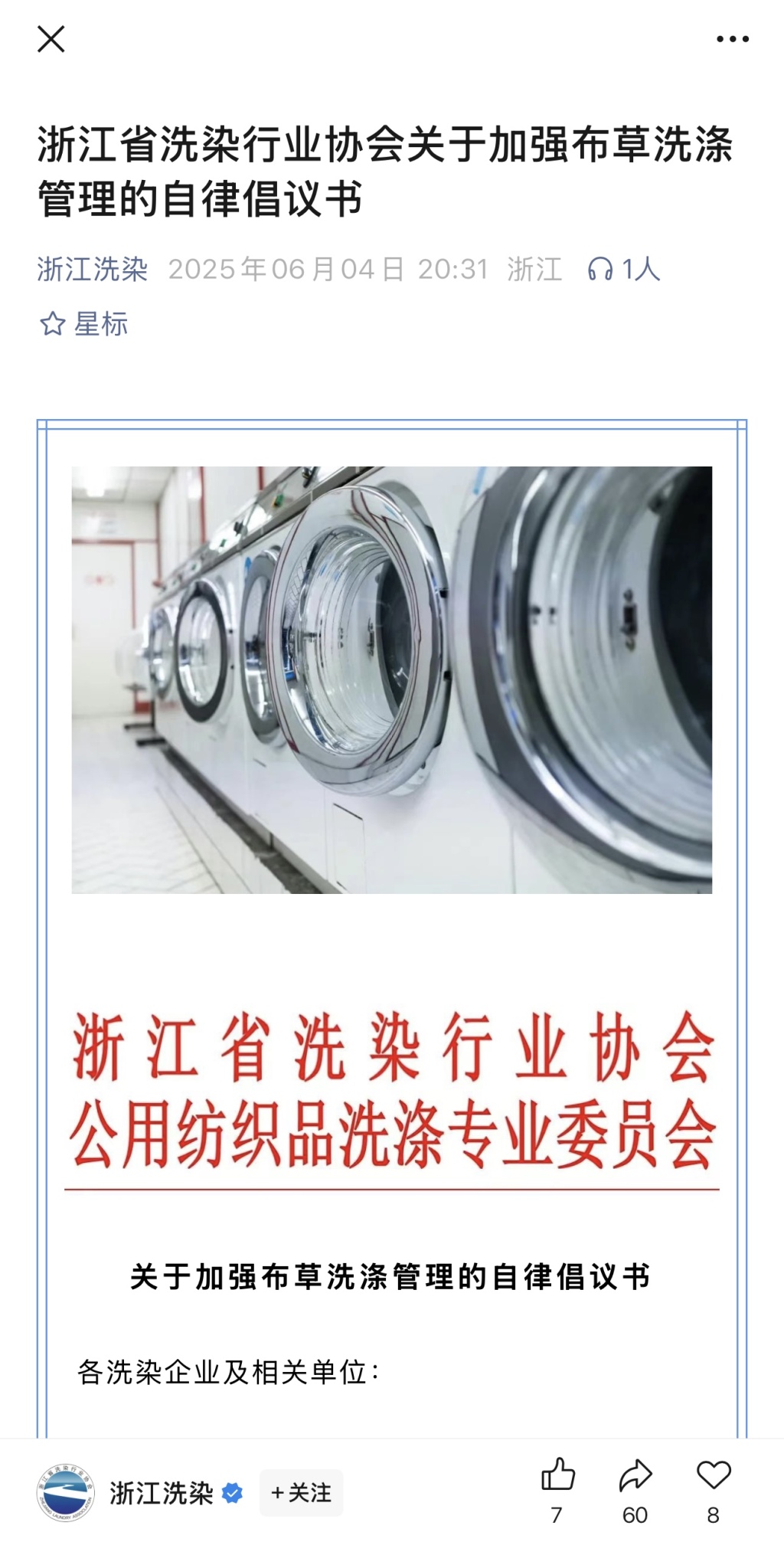 已有行业协会作出相关倡议。6月6日,浙江省洗涤行业协会发布《关于加强布草洗涤管理的自律倡议书》,倡议“医疗布草与普通布草必须严格分开洗涤,要配备独立的洗涤车间、专用的运输工具以及专门的洗涤设备。建立完善的布草分类、分拣制度,安排专人负责,确保每一件布草都能得到正确处理,从源头消除交叉污染的风险。”