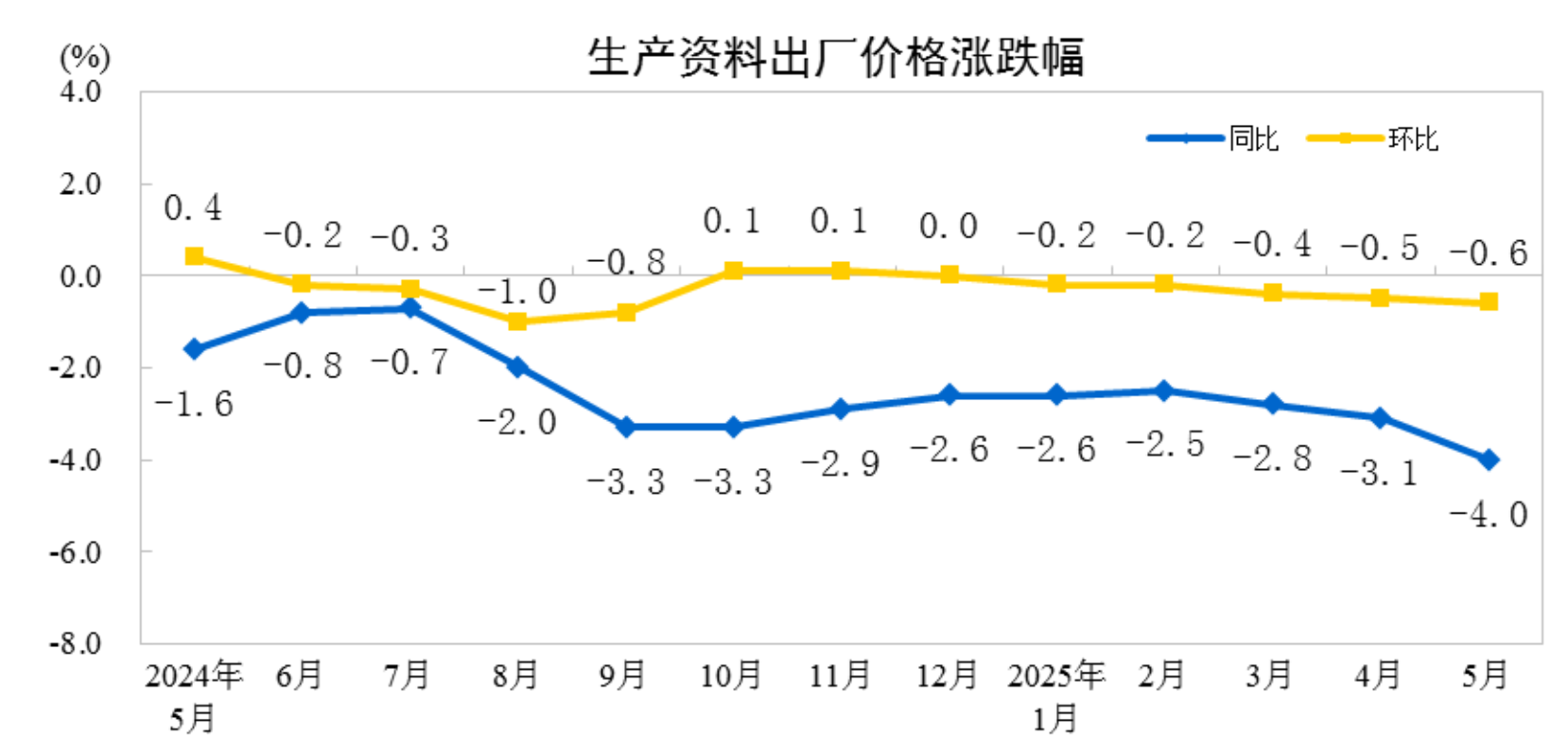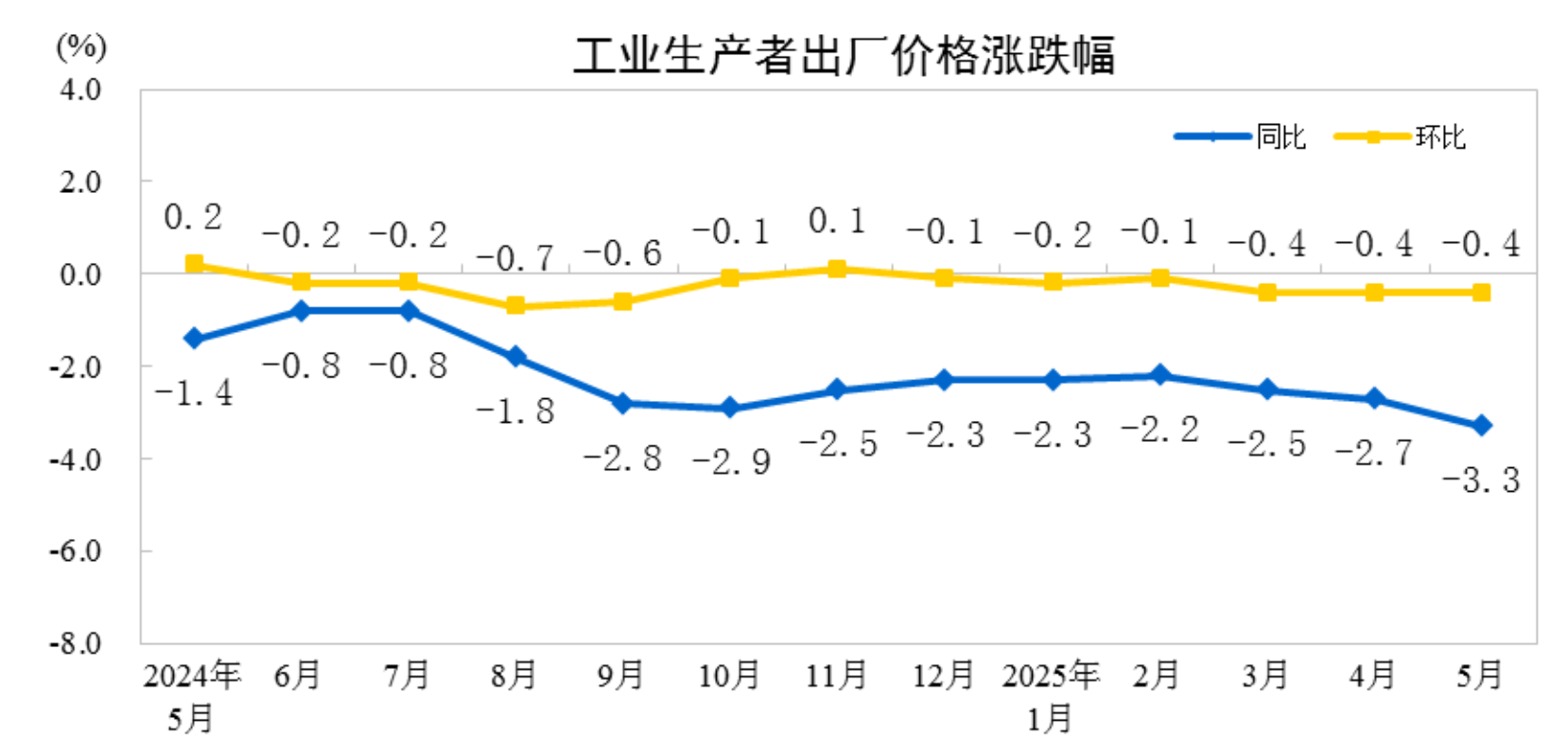 2025年5月份,全国工业生产者出厂价格同比下降3.3%,环比下降0.4%;工业生产者购进价格同比下降3.6%,环比下降0.6%。1—5月平均,工业生产者出厂价格和购进价格比上年同期均下降2.6%。