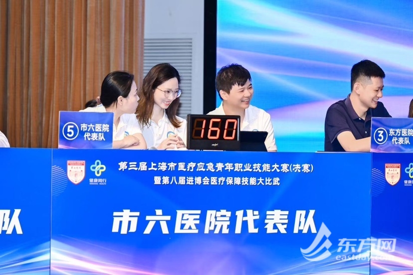 以赛为媒,锻造应急精兵 本次大赛紧密围绕国家紧急医学救援体系建设要求,设置医疗应急管理、诊疗、护理三大竞赛项目,通过必答题、风险题、抢答题三轮激烈角逐,全面考核选手的理论知识、实战操作和团队协作能力。大赛融入进博会医疗保障实战场景,突出“平急结合、以赛促练”的办赛特色。 决赛现场,来自华山医院、市六医院、东方医院、市急救中心、闵行区、松江区、徐汇区、松江区等8支队伍的选手沉着应战,展现出精湛的专业技能和昂扬的青春风采。经过多轮比拼,市六医院代表队及闵行区代表队凭借扎实的综合能力脱颖而出,荣获团体一等奖;华山医院代表队、东方医院代表队、市急救中心代表队、松江区代表队、奉贤区代表队、徐汇区代表队等6支队伍分获团体二等奖。