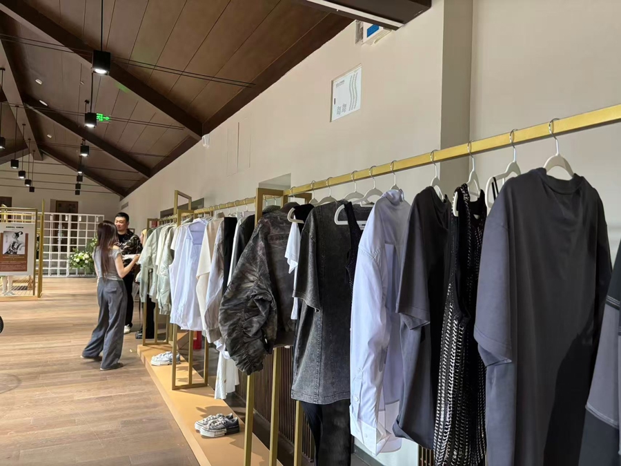 “限量秀款美则美矣,但不够日常。”王逢陈说,因此快闪店放入更多秀款衍生线,保留叶脉染色的T恤、“植物染”元素真丝吊带裙,价格降低却仍具辨识度,满足日常穿搭需求。“限量秀款+商业款”双轨制,是现下的一种尝试:秀场仅部分高溢价款式开放“即买”,其余商业款也同步销售。