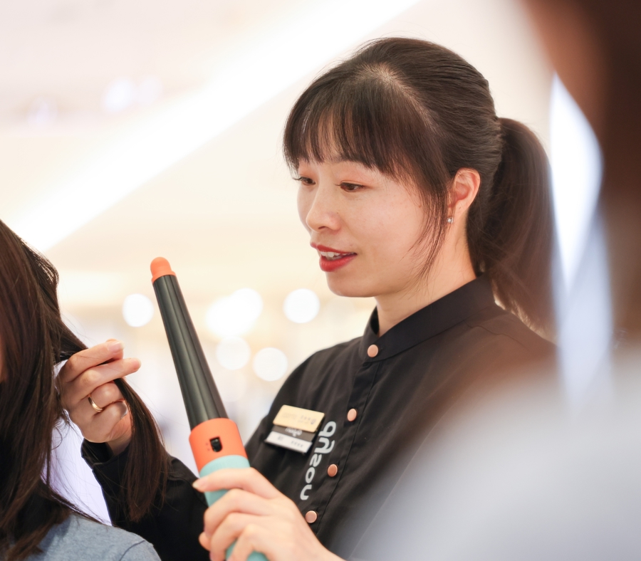 南京东路新世界城7楼戴森柜台销售员方丽为消费者演示产品使用方法。文汇报记者 周俊超 摄