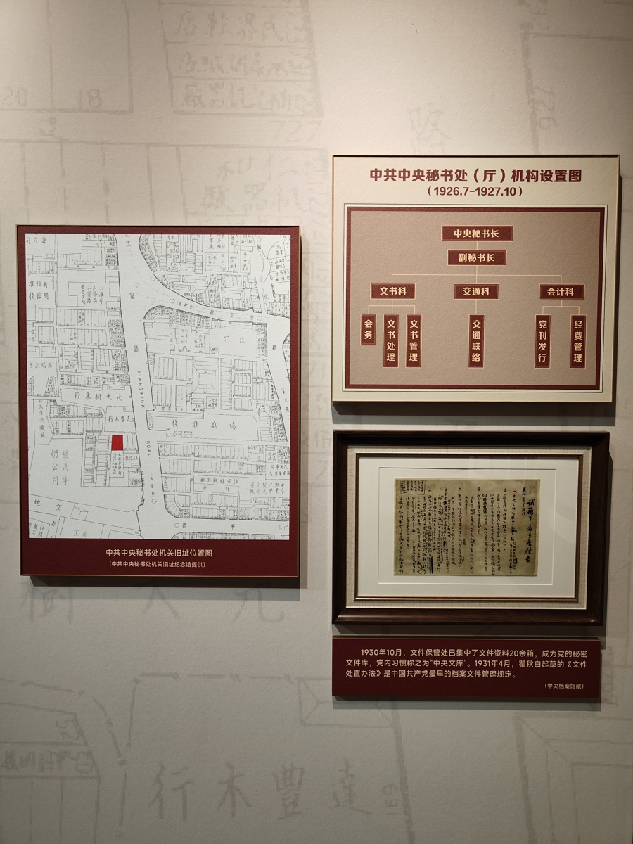 展览展示了中国共产党历史上的第一份通告、最早的入党誓词、第一份惩治贪污腐败的文件等珍贵红色档案,首次集中展示“三大”后中央局机关、“六大”后中央政治局机关、中共中央秘书处机关旧址等多个红色遗址的地块图,并以艺术化的形式重现“三曾里”关捐行、“福兴商号”“福康里电台”等历史场景,多层次、多角度地将中共中央在上海的奋斗足迹呈现给观众。展览还运用AI技术形象地展示隐蔽战线的同志用生命和热血守护中央文库的历史。