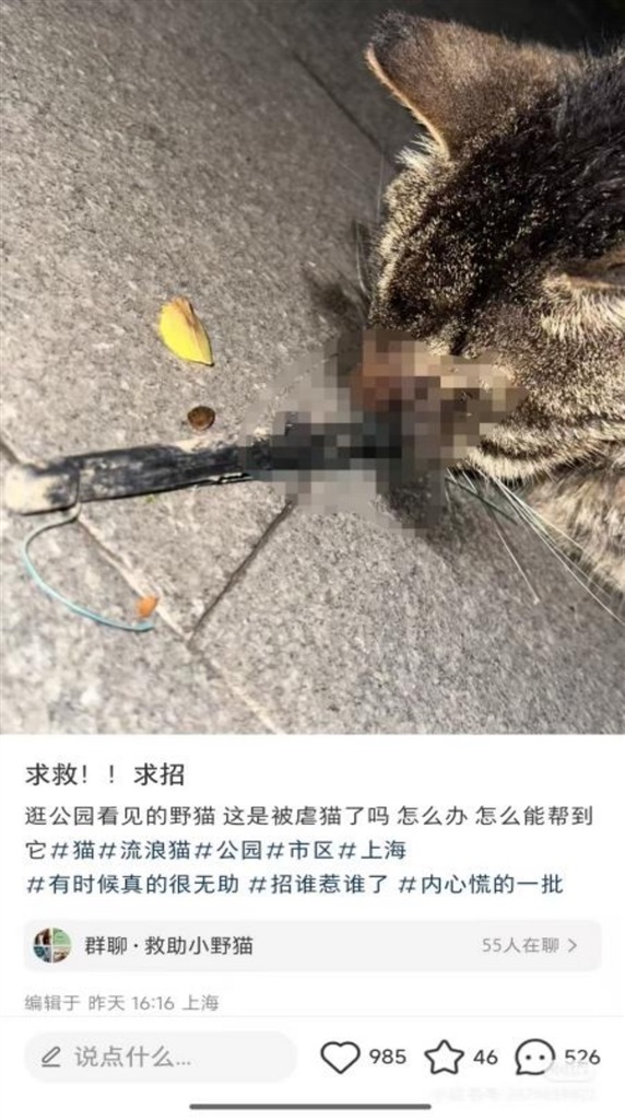 图说:小猫已在医院接受治疗。 图源:受访者 记者看到,照片上一根细长的圆锥插入了一只猫的脸部。物体与猫的接触部位,疑似为金属锋利结构。“我们看照片感觉是鱼镖。”傅先生称,照片发布当晚,就有住在公园附近的市民自发前往现场寻找受伤的猫。 陌生的热心市民们一起在复兴公园内外找了6天。“就在我们快放弃的时候,6月8日,公园咖啡厅工作人员联系我们说看到了这只猫。”随后,他们前往现场拉网抓猫。 “最近上海一直下雨,就当所有人认为小猫快不行了,没想到它坚强地还活着。”在专业救援人员的帮助下,这只伤势严重的猫终于被抓住了。不过,射入猫脸部的物体不见了。