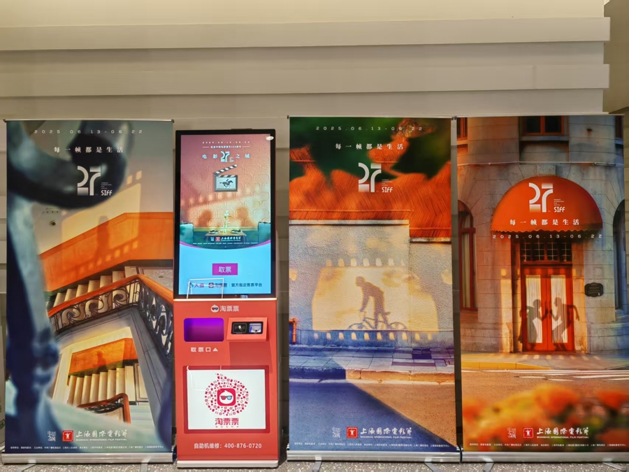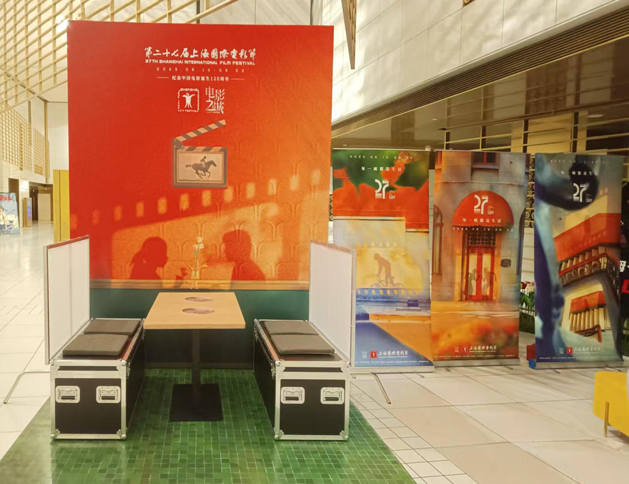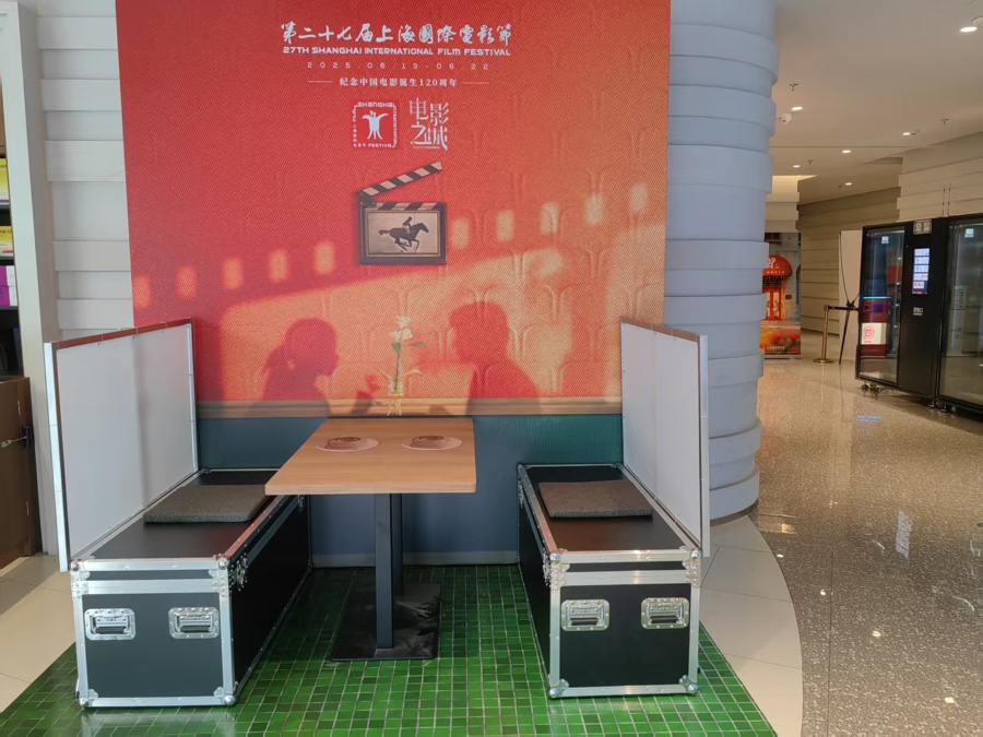 6月9日,记者在部分影院看到,第27届上海国际电影节主视觉海报被还原搭建为三维场景装置,一桌二椅皆成实景,影迷可以入内拍照留念,也可在此交谈、小憩。