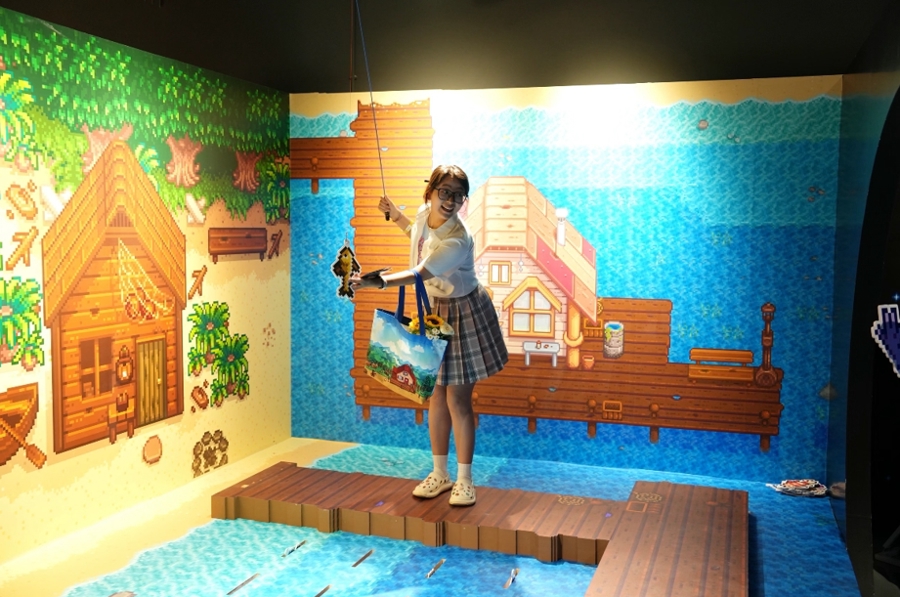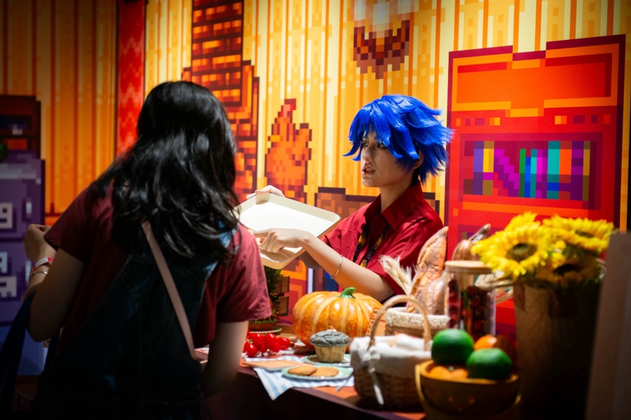 展览将游戏中的经典场景与互动体验深度融合。步入展厅,观众首先可以进入“游戏加载页面”拍照打卡,还能阅读游戏初始阶段爷爷寄来的信件,打破次元壁,踏入真正的游戏世界。进入展区,观众不仅可以参观“巴士站”“鹈鹕镇广场”“乔家超市”“皮埃尔杂货店”等标志性游戏中的建筑,还能随时偶遇像素风的村民。沉浸式的互动项目则以游戏玩法为基础进行了精心设计,观众可以在餐厅领取工作人员发放的菜谱,寻找对应的菜肴;在“乔家超市”,大家化身理货员,给不同季节生长的种子分类;场内还有垃圾桶装置供玩家“捡垃圾”、池塘里也能“钓”到各种稀有鱼类;展览末尾,每个人还能给自己喜爱的角色送上游戏里代表爱意的一束小花……参与各个项目的互动都可以收集相对应的印章,集齐4个印章就可以抽取奖品。