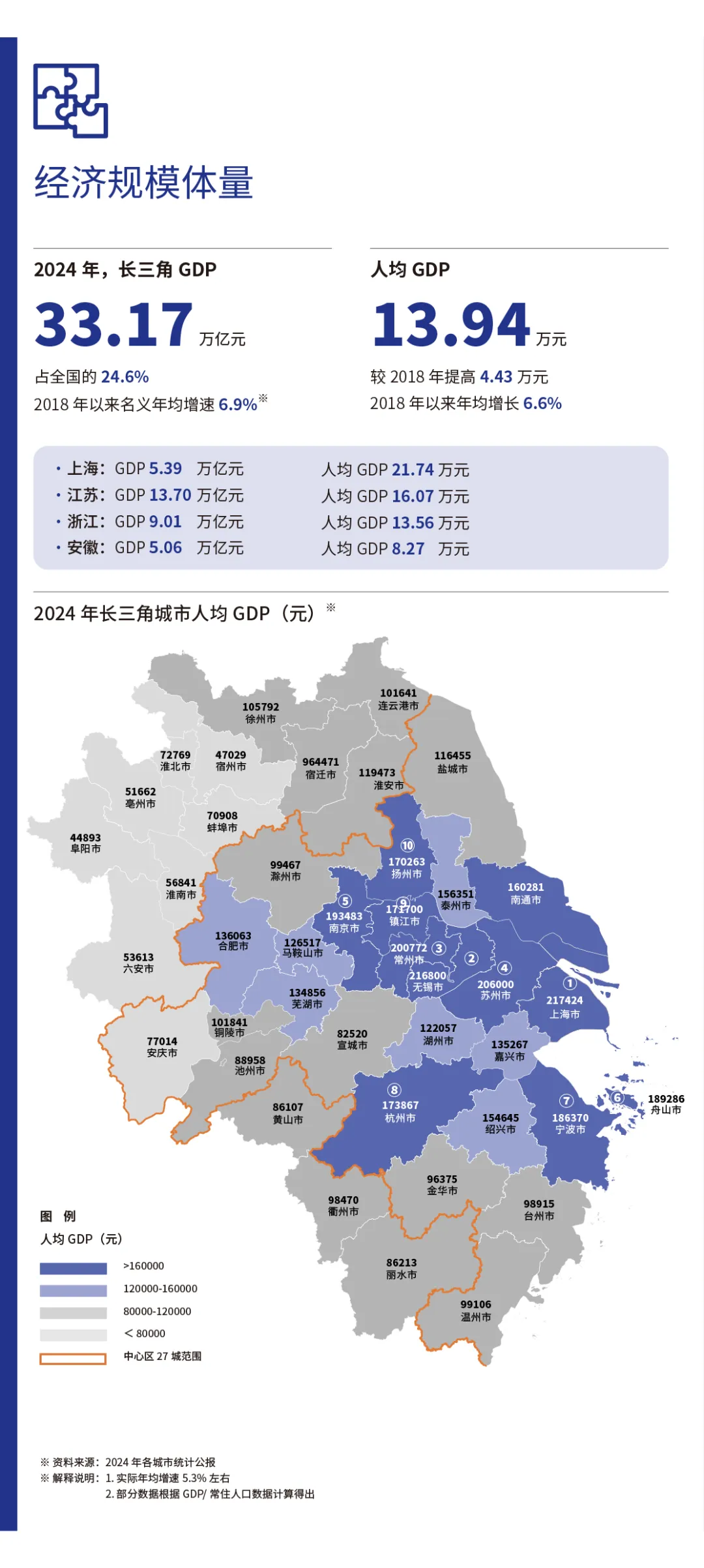 长三角地区是我国经济发展最活跃、开放程度最高、创新能力最强的区域之一,在国家现代化建设大局和全方位开放格局中具有举足轻重的战略地位。2024年,长三角地区经济总量突破33万亿元,以仅占全国4%的国土面积,创造了全国近1/4的经济总量,集聚了全国约17%的人口,对全国经济增长的贡献率约为30%。自2018年长三角一体化发展上升为国家战略以来,取得诸多成果,是我国经济发展的压舱石和动力源。
