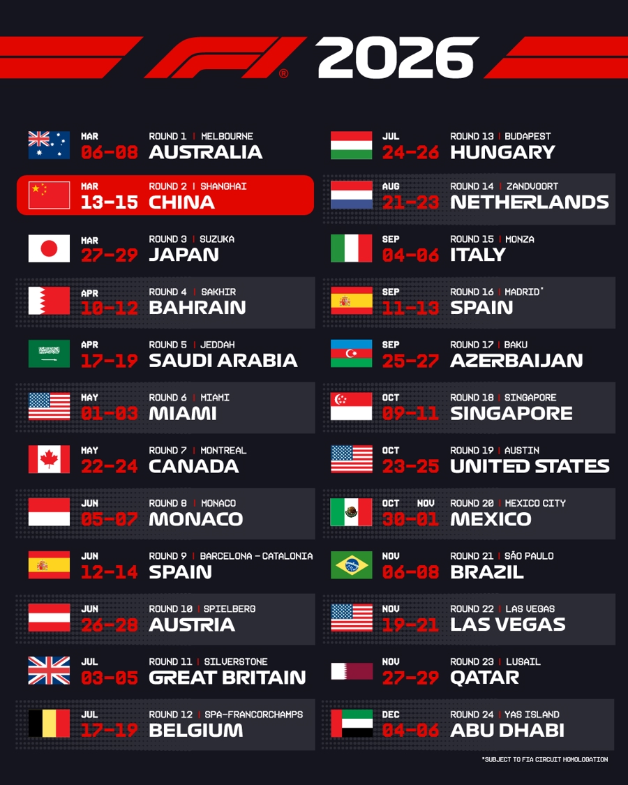 本赛季的F1大奖赛正进入关键时刻,下赛季的赛程安排也已出炉。6月10日,F1通过官方社交媒体发布了2026赛季的比赛安排,备受期待的中国大奖赛将于明年3月13日至15日在上海国际赛车场举办。