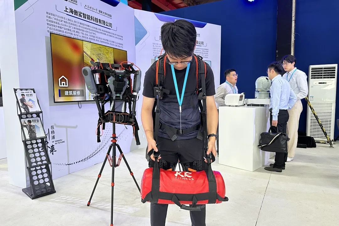 在上海傲鲨智能科技有限公司的展台,一位工作人员穿着腰部外骨骼机器人,轻松地模拟搬运重物。他介绍,这款机器人能有效助力,避免工人的腰椎和肌肉损伤。“除了工业上肢、腰部的电动外骨骼,我们今年7月还将发布一款面向C端的消费级外骨骼机器人,聚焦助行场景。”