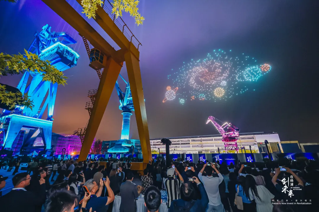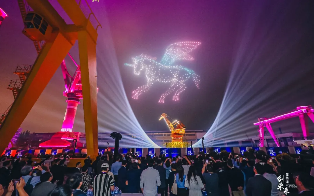 会后,与会中外嘉宾一起欣赏无人机与灯光秀表演。黄浦江畔,悠扬的音乐缓缓响起,1000架无人机从水岸边起飞,上演一场璀璨夺目的灯光秀。光影与塔吊交相辉映,演绎科幻未来的奇妙光影,全面展示这座越来越“YOUNG”的人民之城。