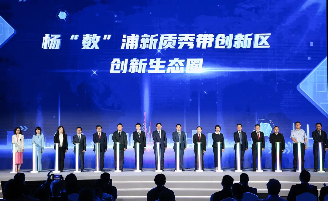 推介大会现场,周海鹰、屈炜、彭慧胜与上海交通大学、同济大学、上海财经大学、上海理工大学、上海开放大学、上海体育大学、上海电力大学、上海海洋大学、上海国有资本投资有限公司、交通银行上海分行、北京大学软件工程国家工程研究中心、“启迪之星”高质量孵化器、上海清大科越能源科技有限公司等高校、科研机构和企业携手发布共建杨“数”浦新质秀带创新区创新生态圈倡议。