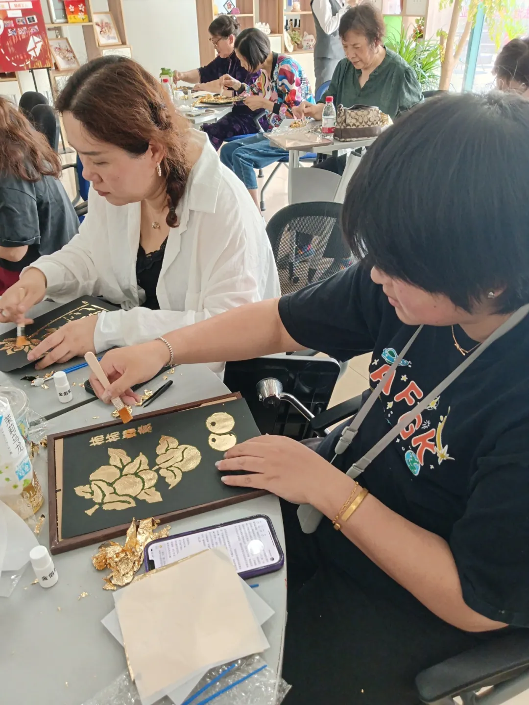 制作现场瞬间化作专注而温馨的艺术工坊。居民们屏息凝神,依老师指导,先用画笔蘸取胶水,沿着图案线条精准描绘;随后轻捏柔软金箔,小心翼翼覆盖其上。最考验耐心与巧劲的当属“扫金”环节——用小刷子极其轻柔地拂去多余箔片,稍有不慎,薄如蝉翼的金箔便可能破损。