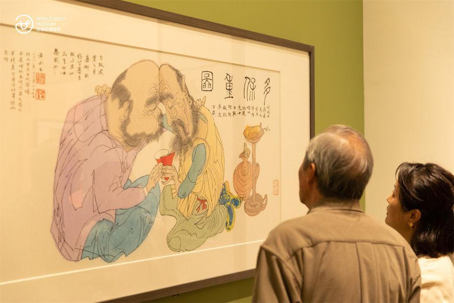 黄永玉的作品如同一面多棱镜,折射出人间百态,呈现的“黄氏幽默”,透着犀利、辛辣,甚至荒诞的独特味道。展厅之内,三两成群的人,围聚在画作前,指着画中的诙谐之处,脸上洋溢着会心的微笑。展厅结尾处,那幅名为《今夜》的星空画作,如灯塔般照亮无数未眠人的归途。观众穿行于黄永玉笔触下的自由天地,感受他画笔之下的深邃与热忱,见证一个艺术家如何以色彩为信仰,对抗岁月荒芜。题跋中那句“愿上天给人间每个人都有美好的今夜”在幽光中浮动,观众静立,在头一次开放午夜场的世博会博物馆里感受宁静与美好。