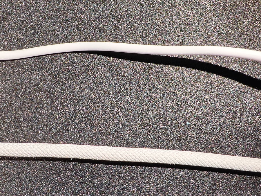 绝缘被采用不同材质的充电线,从上到下依次是:PVC、TPE、尼龙编织;PVC与TPE照片分辨不明显,但手感完全不同。