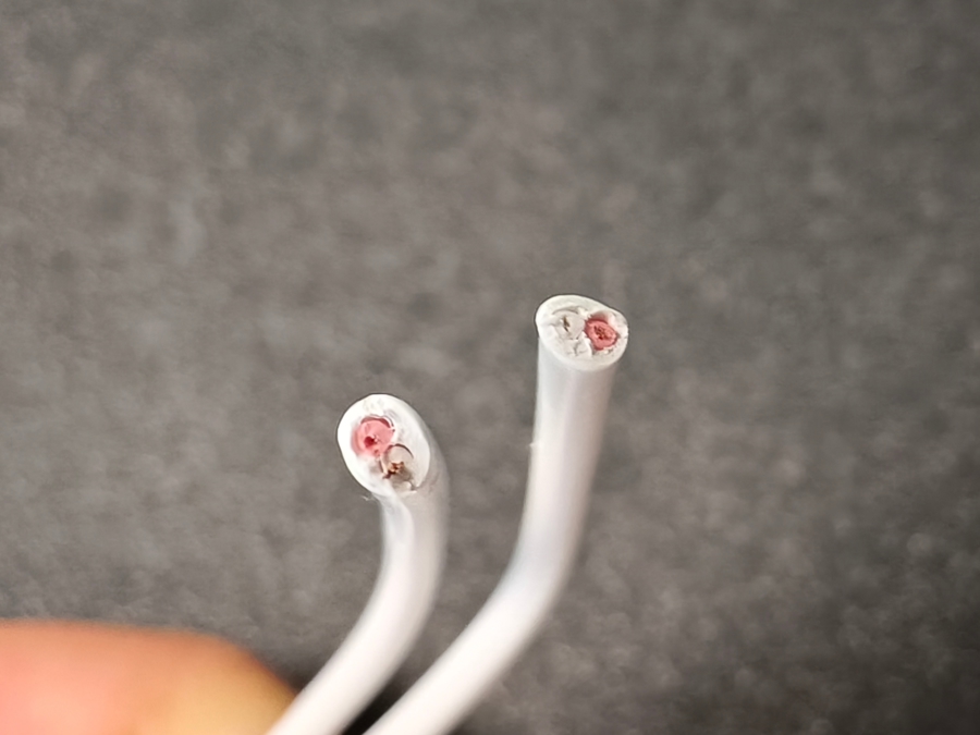 剪开“三无”充电线,会发现内部构造极其粗糙,导线细不可见。