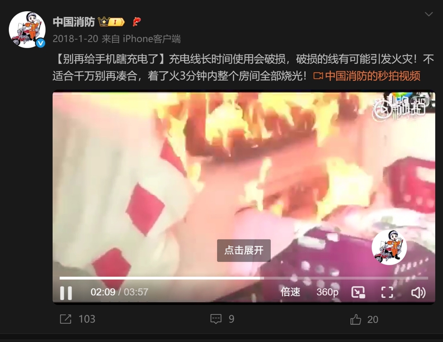 @中国消防很早就发布过视频提示充电安全(图源:微博@中国消防)。