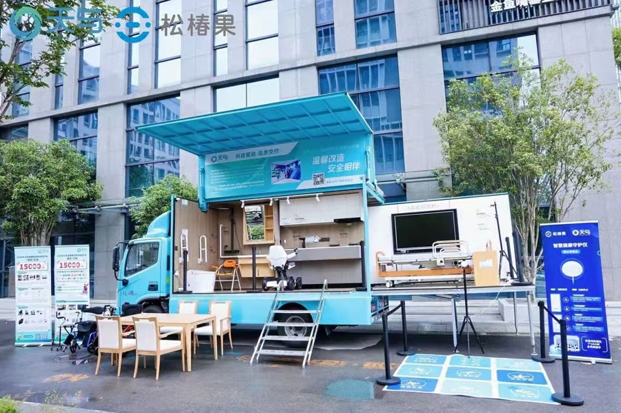 天与创新研发的智慧适老化改造全场景体验车——“银龄智慧方舟”。这辆轻型专门用途货车,不仅承载着适老化改造的核心理念,更是一个移动的智慧养老体验中心。该车以亮绿色为主色调,象征生命活力与行业革新,集场景化体验、智能化产品交互与全链条服务于一体,旨在通过移动化、可视化的方式,重新定义居家适老化改造标准,破解老年人居家改造“认知难、选择难、体验难”的痛点,为老年群体提供“看得见、摸得着”的改造解决方案。