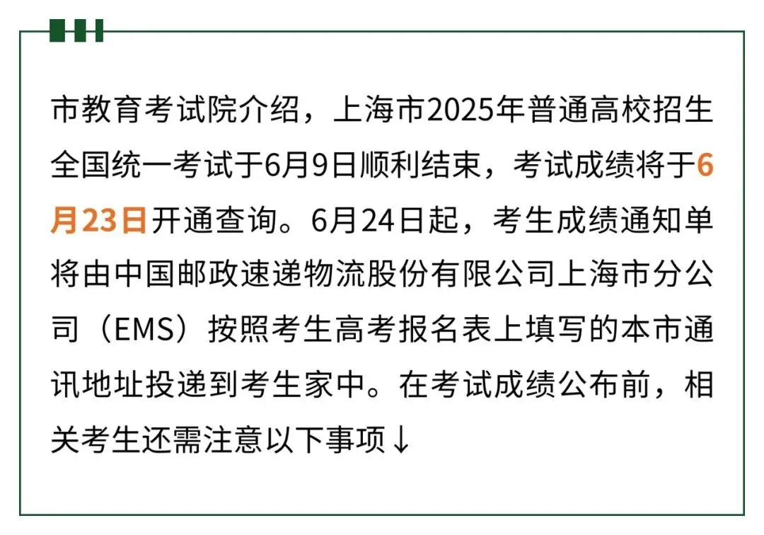 1.已参加2025年本市普通高中学业水平等级性考试的考生,可于6月10日14:00起通过“上海招考热线”网站(www.shmeea.edu.cn)查询成绩。若对本人考试成绩有疑问,可于6月11日10:00至12日16:00通过“上海招考热线”网站申请成绩复核。