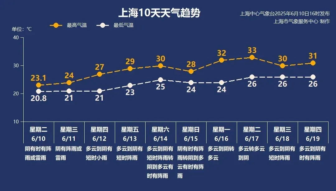 周四和周五上海处在梅雨带边缘,云多雨弱,阳光也会串串场,气温逐步上升,最高在27-29℃,加上湿度大,潮湿闷热的体感变得更加明显。