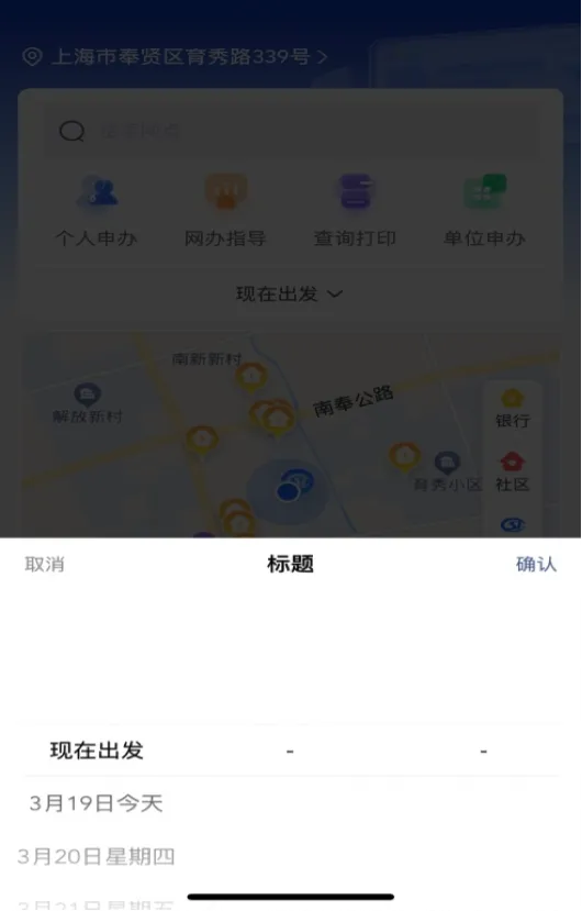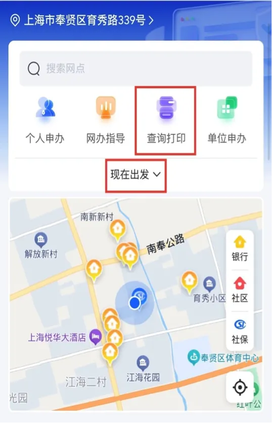 根据您的个人需求,可自定义办理时间(图中标签:现在出发下拉框)、自定义业务种类(图中标签:个人申办、网办指导、查询打印、单位申办)、自定义办理场所(图中标签:银行、社区、社保),获取相应的网点列表。以查询打印社保缴费证明为例,点击“查询打印”,自定义办理时间,即可获取符合办事需求的网点列表;