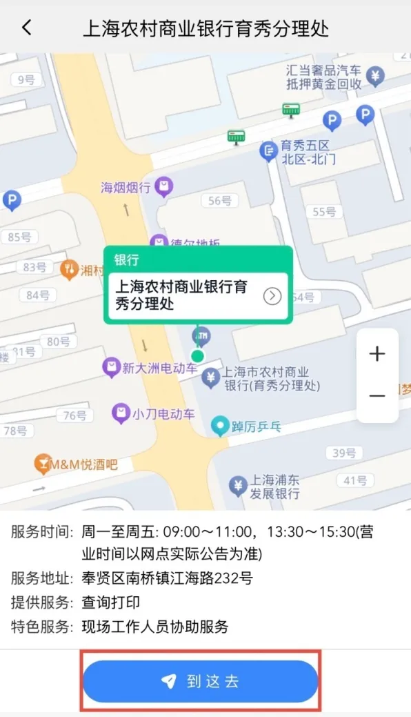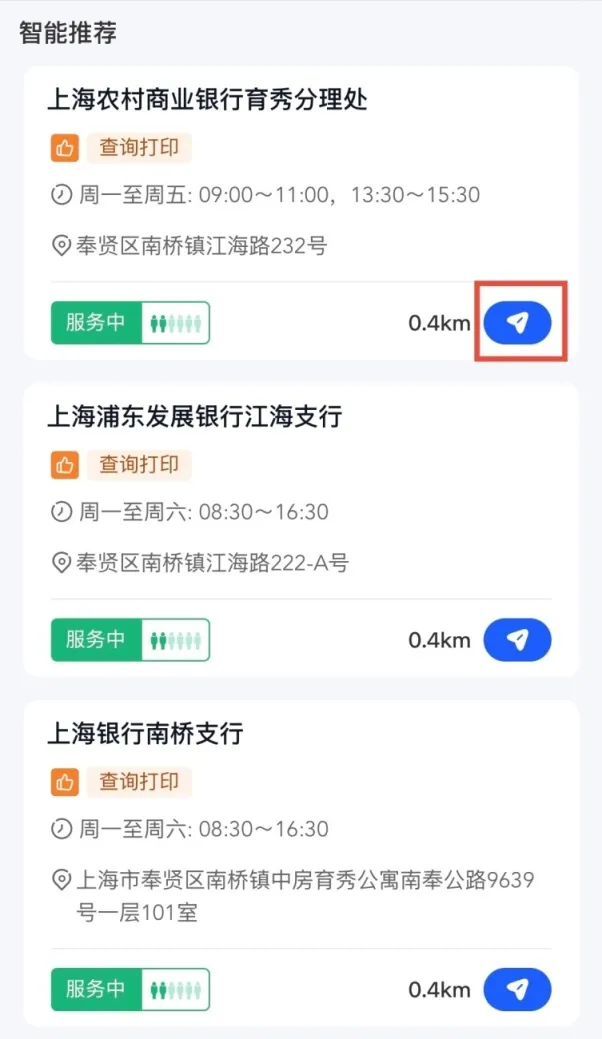 智能推荐列表可以看出网点的营业时间、地址、忙闲状态等信息,根据您自身的需求选择办事网点,点击导航按钮即可前往。