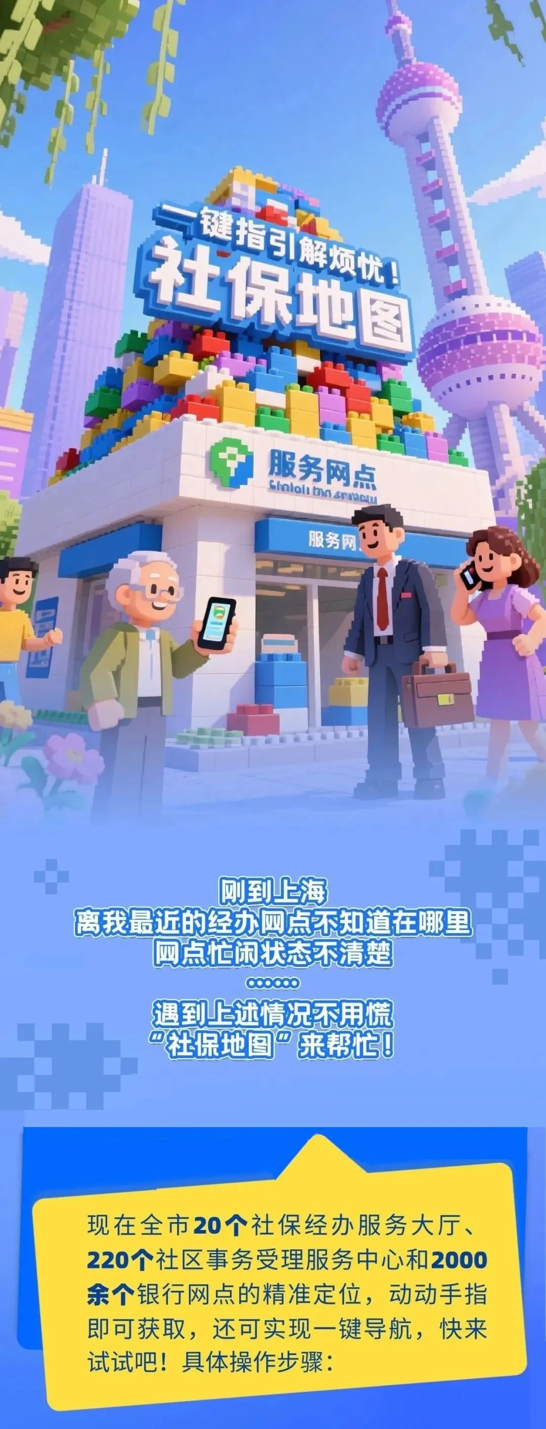 “上海社保地图”来啦!一张电子地图,上海各个社保办理网点一目了然,还提供导航功能~来看市人社局的介绍↓