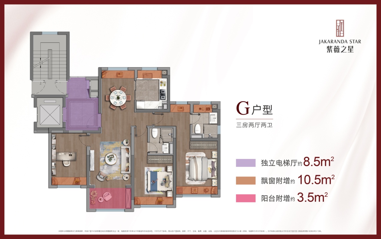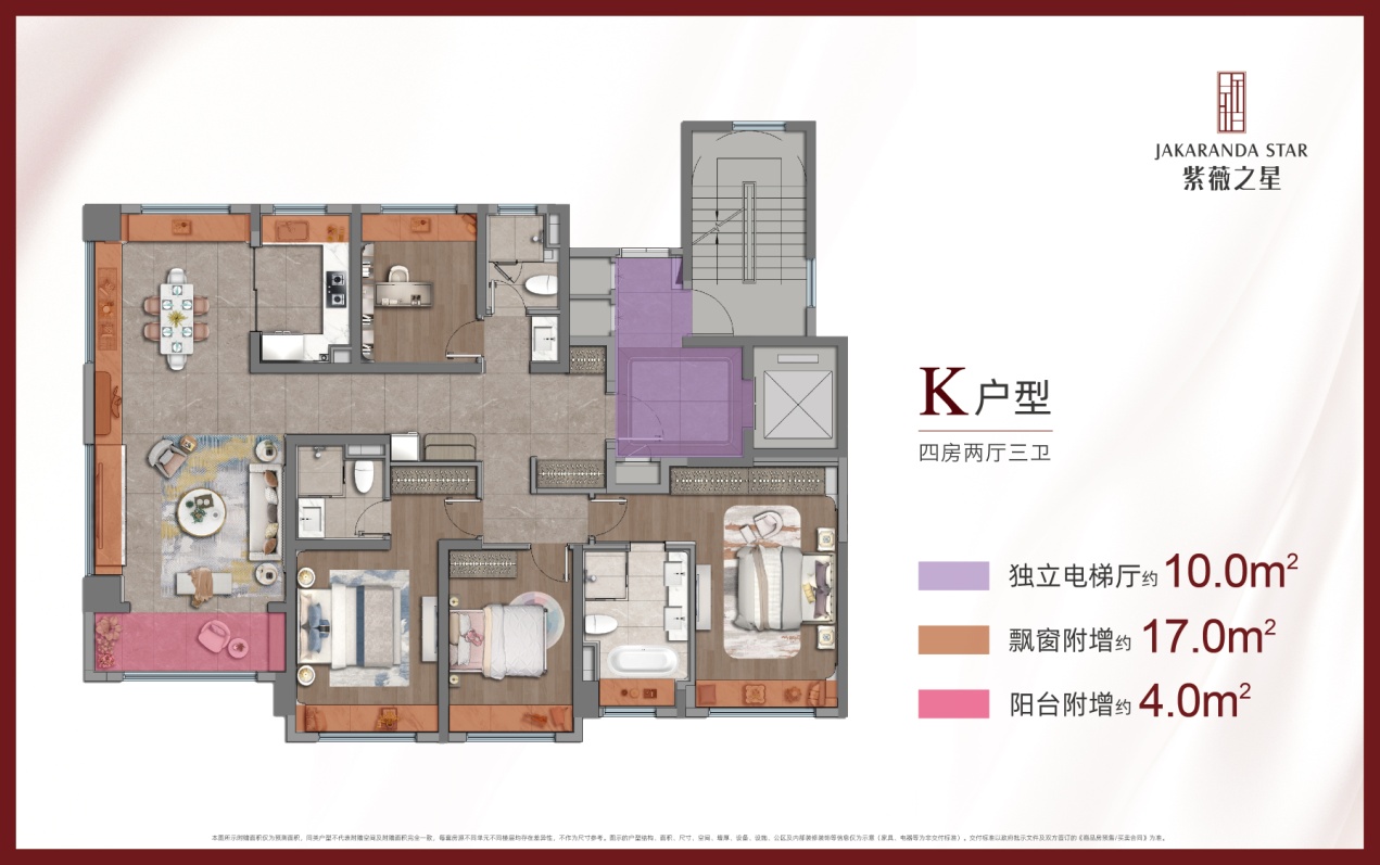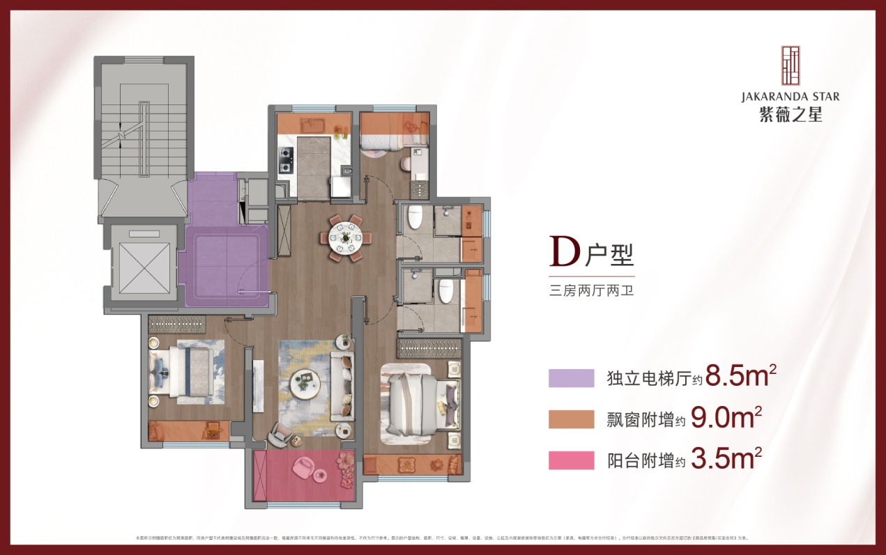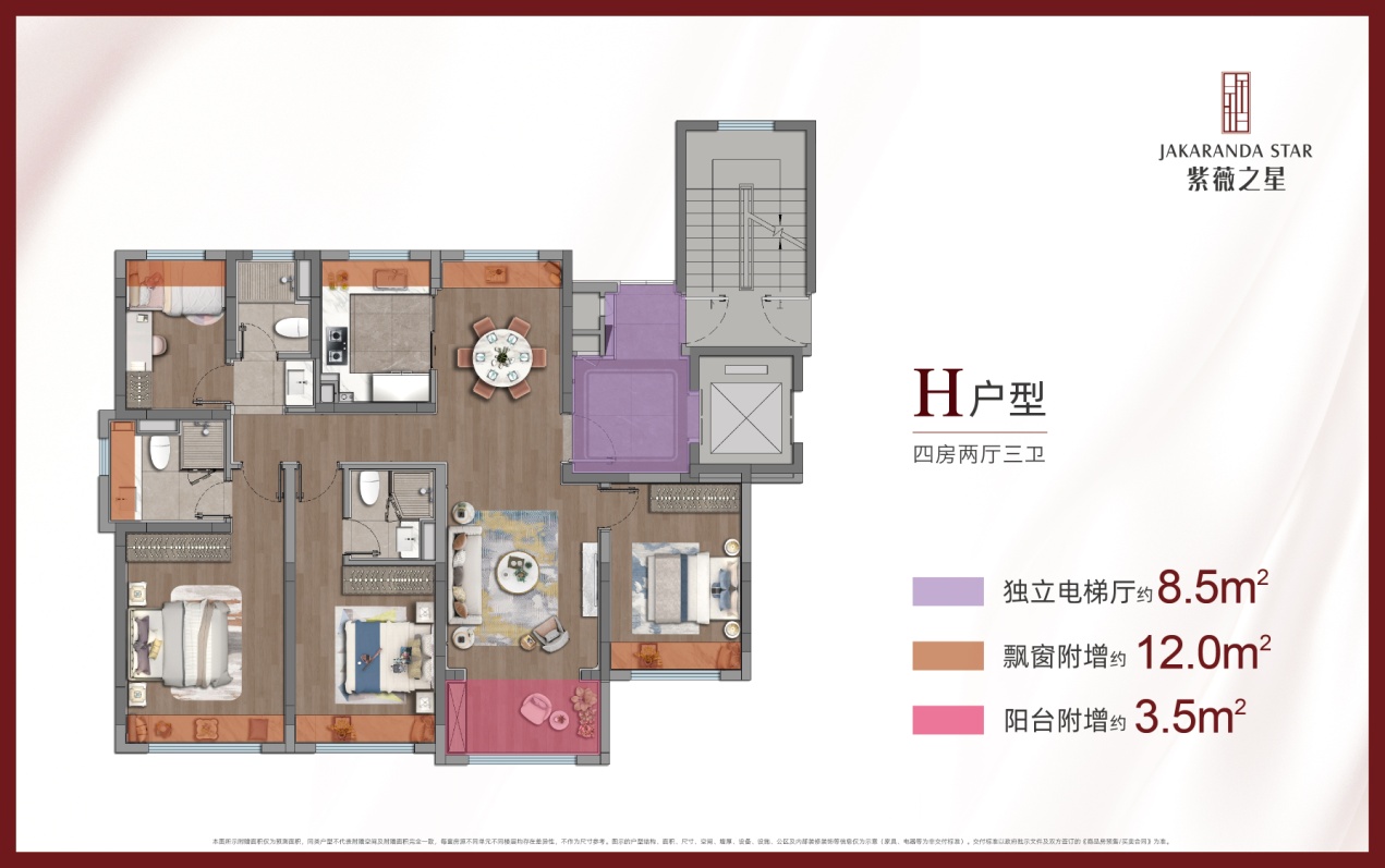 本资料仅作为项目介绍之参考,不得作为要约或承诺。周边环境以现状勘察及政府规划文件为准。项目设计方案后期存在变更调整的可能,每套房源不同单元不同楼层均存在差异性。买卖双方的权利义务及交付标准以双方签订的《商品房预售/买卖合同》等书面文件为准。开发商保留在购买人未经通知的情况下对宣传资料修改的权利,敬请各购买人留意最新资料。本资料解释权归上海宝苑华盈房地产有限公司所有。本宣传资料自发布之日起有效期一个月。本项目推广名:紫薇之星;备案名:桃浦紫薇星苑。