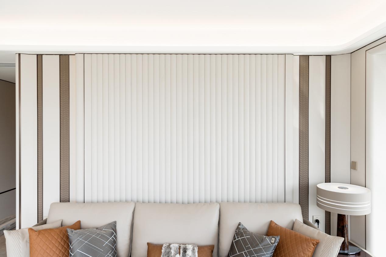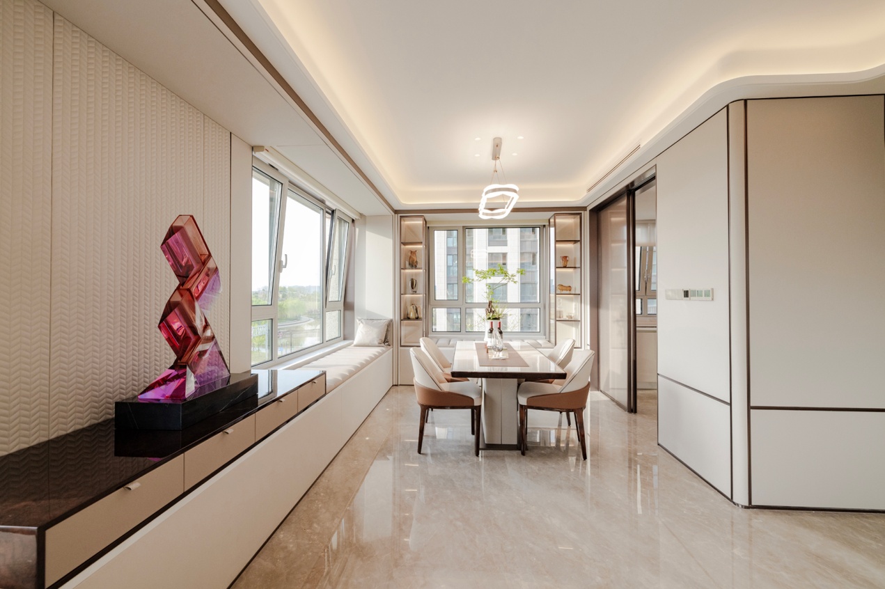在3.15米层高空间中,梁志天设计的悬浮吊顶宛若晨曦初透云隙的光晕层叠,垂落月色柔光,氤氲出银河倾雾般的朦胧诗意。