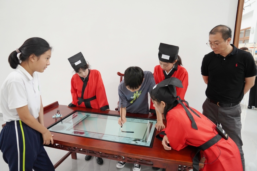 而在智能书法体验台区域,也有不少观众驻足体验 —— 无须纸墨,仅执普通毛笔即可在屏幕上临摹名家碑帖,系统还能实时生成书法作品并支持保存,科技与传统的巧妙融合让古老艺术焕发新生机。
