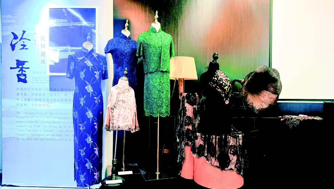 在各色展品中,一件集数十种非遗工艺、有近200年历史的“十八镶滚”清代服饰珍品令人驻足,其配色优雅,见缝不见针的绝技覆盖整块绫缎,充分展现出中国传统工艺价值。展厅内,一蓝一青两件来自民国后期的手工蕾丝名媛姐妹社交礼服则充满了异域情调。据了解,该系列展品采用舶来蕾丝与传统旗袍相结合的设计形式,缠绕于底层通花蕾丝之上的车骨蕾丝形成丝丝缕缕的立体感,短袖蕾丝旗袍加上马甲的穿搭形式,展现出前卫而不失优雅的海派风格,这也是杨明明多年前自海外带回的珍品,目前为美国华盛顿华人博物馆馆藏。