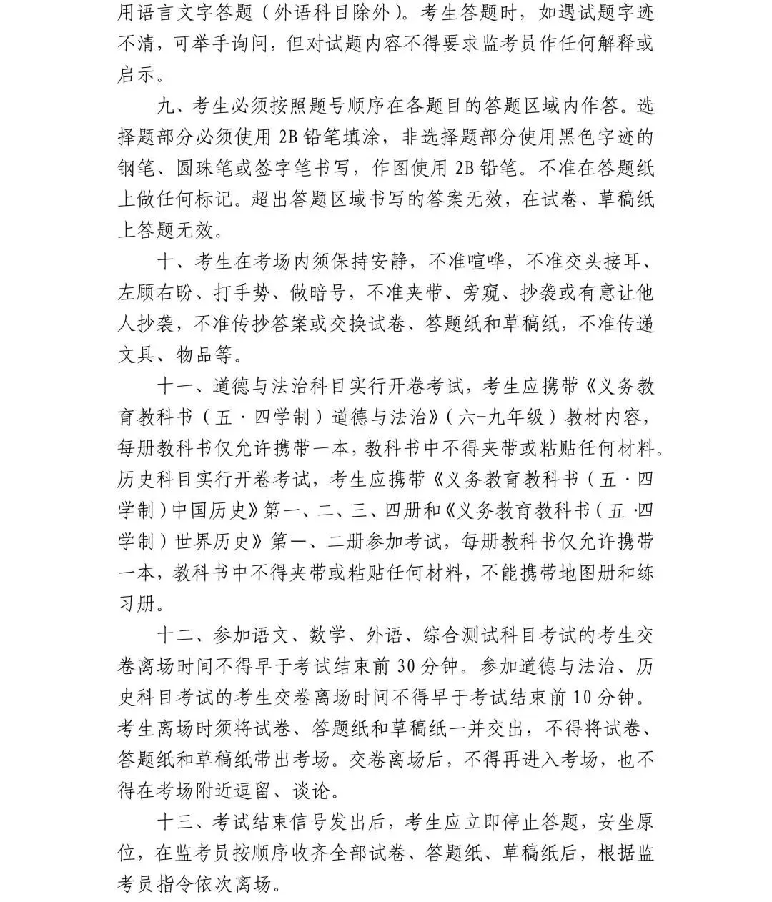综合测试、数学考试入场时,请考生一并携带历史(若参加)、道德与法治教科书进入考点。离场时,请考生随身携带好准考证,考试换场期间,请考生听从考点工作人员安排,有序取书,返回考场需要重新核验准考证。