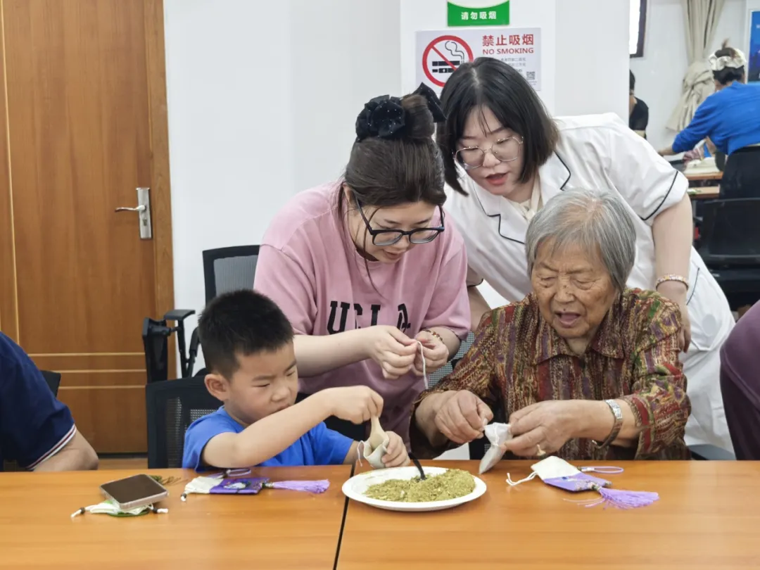 另一边,内江新村幼儿园的老师和小朋友们的到来,给现场增添了许多活泼的气息。他们陪伴着社区的老人们一同做起手指操,还一起动手制作香囊。在互动与协作中,一幅代际交融的和谐画面徐徐展开。