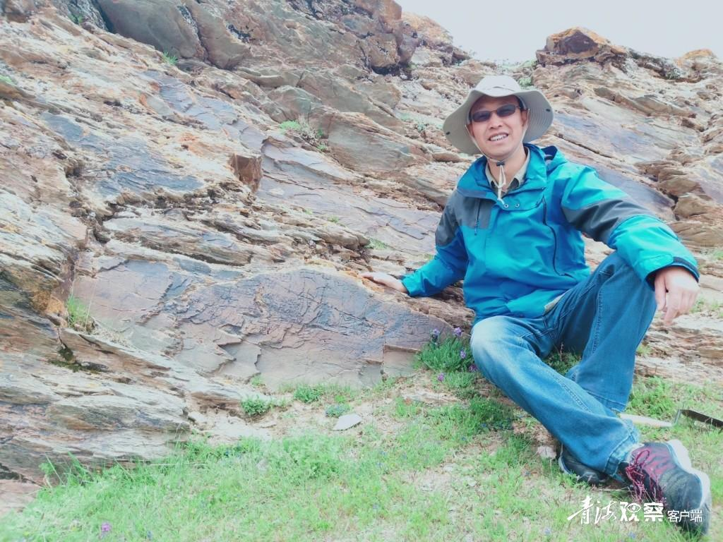 侯光良与石刻合影。图源,青海观察客户端