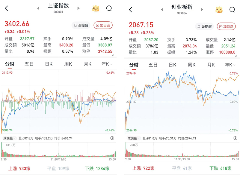 至收盘,上证综指涨0.01%,报3402.66点;科创50指数跌0.3%,报977.97点;深证成指跌0.11%,报10234.33点;创业板指涨0.26%,报2067.15点。