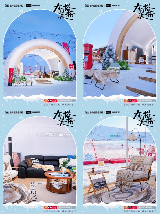 活动中,林氏木业推出混搭风套系产品——繁花系列(VE系列),将典雅法式复古与精致奶油风融入冰天雪地。纯白雪景成为天然画布,凸显产品设计反差感,19个SPU与48个SKU组合出上百种生活方案,精准解决年轻用户“搭配难”痛点。通过拱门元素冰雕展陈、半弧形“雪搭子”家居展馆,品牌传递“有一搭美一搭”主题,呼应消费者对个性化、高质价比家居的需求。