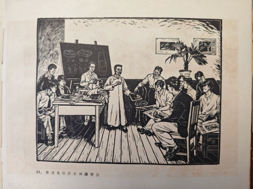 此次展出的李桦《鲁迅先生在木刻讲习会》定格下重要历史时刻——鲁迅于1931年发起木刻讲习会,引进西方木刻连环画和苏联版画作品。比利时版画家麦绥莱勒的“木刻连环画故事”,由鲁迅亲自推荐出版,以其独特的艺术风格和深刻的思想内涵,赢得了广大观众的喜爱。此外,鲁迅还通过与苏联版画家交换宣纸等物品,收集了他们的手拓作品,并汇编成《引玉集》出版,进一步推动了中外艺术交流。