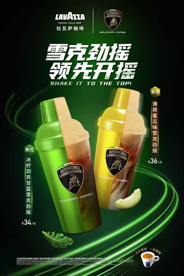 联名推出的雪克劲摇系列,作为此次合作的重头戏,包含四款创新饮品。6月12日,冰柠羽衣甘蓝雪克劲摇与薄荷蜜瓜味雪克劲摇领先“开摇”。购买雪克劲摇双杯套餐,联名咖啡豆或两盒咖啡液,消费者将获赠限量兰博基尼汽车联名款马克杯。绿色、黑色、黄色三款配色灵感源自兰博基尼汽车经典配色,而黑色保温杯则以哑光质感呼应超跑内饰。