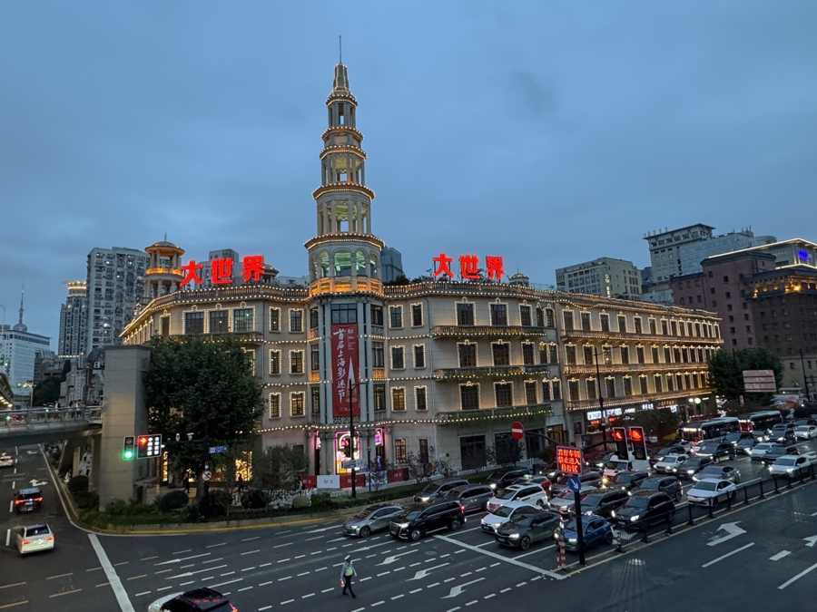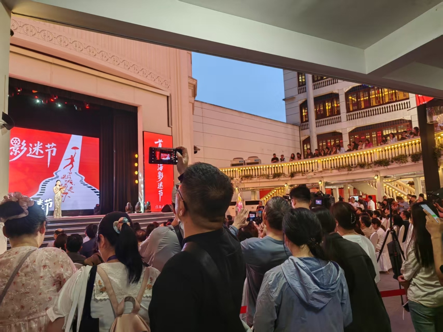 走入上海大世界,浓郁的节日氛围扑面而来。仿佛从默片时代走来的高跷艺人拿着拍摄电影的装置道具与观众互动,环绕建筑外围设置的“主角是你”艺术装置、“影迷action!”创意打卡墙等,吸引众多影迷驻足拍照。
