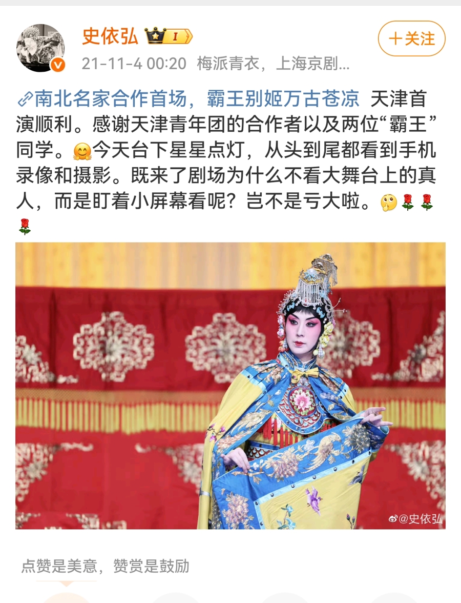 四年前,京剧名家史依弘在外地演出时曾发了一条微博,“今天台下星星点灯,从头到尾都看到手机录像和摄影,既来了剧场,为什么不看大舞台上的真人,而是盯着小屏幕看呢?岂不是亏大啦?”
