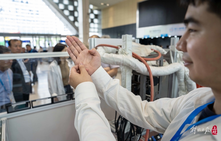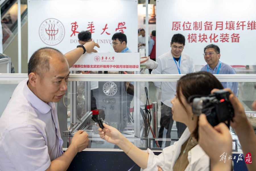 6月12日,上交会东华大学展台上,工作人员正在展示自主研发的“原位制备月壤纤维模块化装备”。