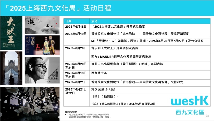 6月18日至6月22日,香港西九文化区管理局将举行“2025上海西九文化周”。活动以“沪港双城,艺脉相承”为主题,展示7项文化艺术节目,包括香港M+博物馆和香港故宫文化博物馆策划展览、原创粤语音乐剧《大状王》,以一系列戏曲、音乐及舞蹈节目。