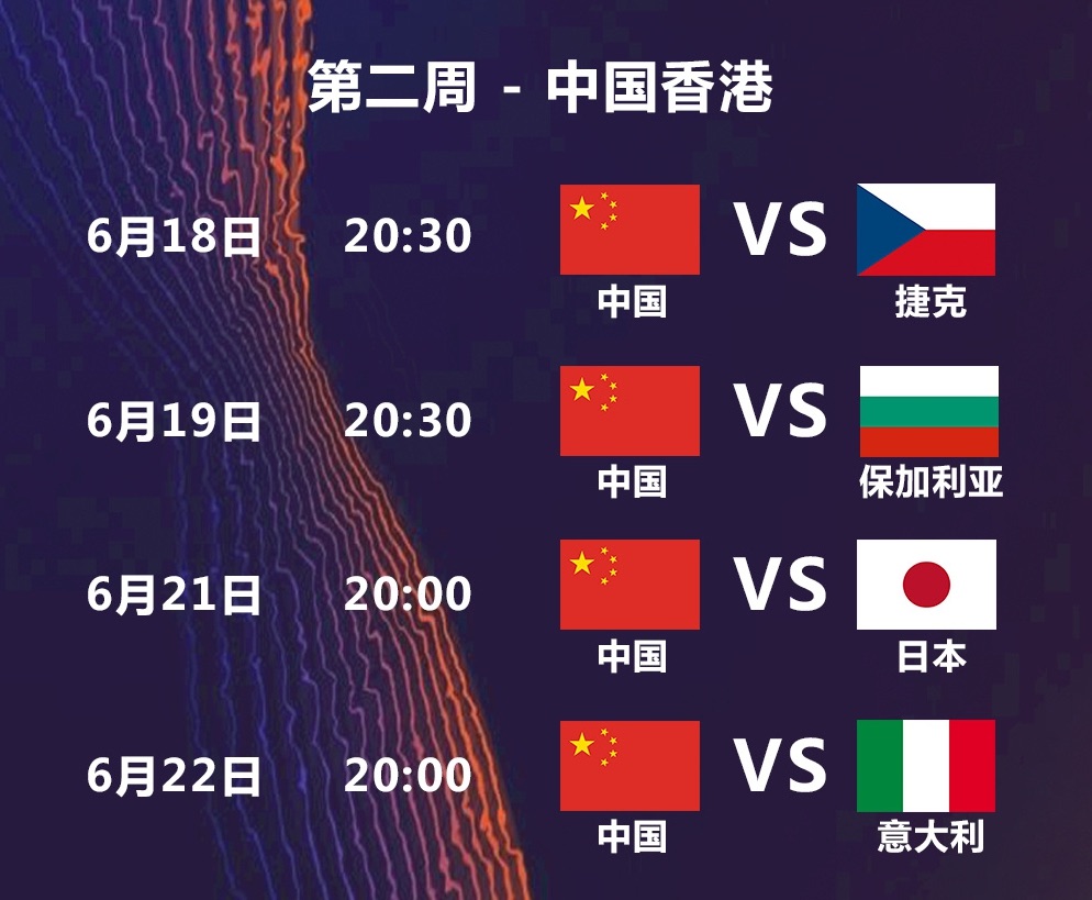 6月18日至22日,世界女排联赛香港站举行,中国女排将先后与捷克、保加利亚、日本、意大利女排交手。此前,中国女排以2胜2负的成绩结束北京站的比赛。7月,中国女排将赴美国参加阿灵顿站比赛。