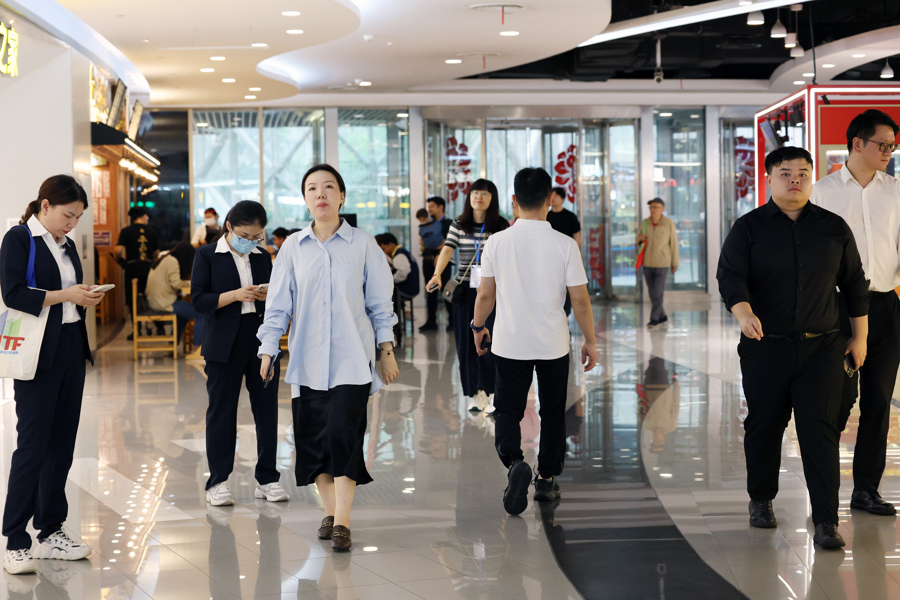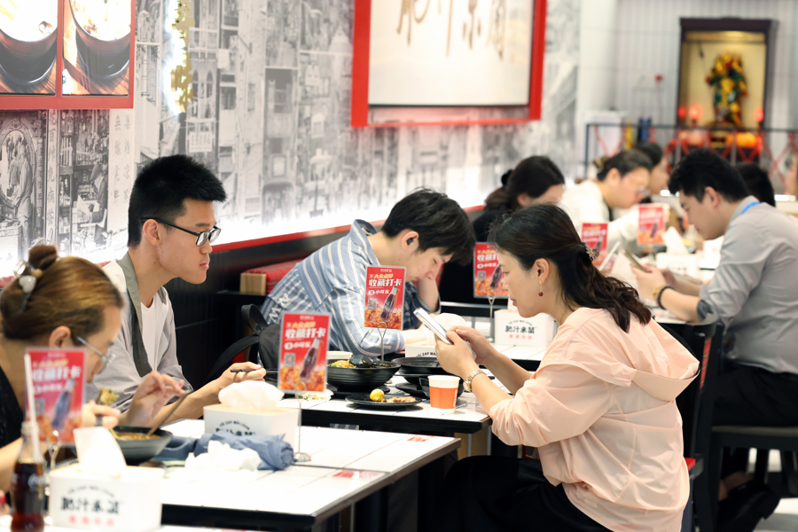 2025年6月12日中午,和上交会举办地世博展览馆一路之隔的世博源商圈顾客盈门,不少餐饮店外甚至排起长队,宛若遇上周末节假日。