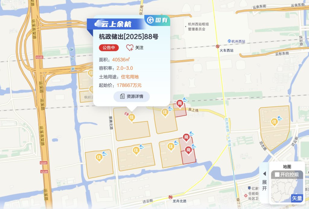 按照出让公告,杭政储出[2025]88号地块即余杭区西站新城单元YH080601-13地块,该地块东至规划公园绿地,南至云门大街,西至景腾北路,北至众成街。地块出让面积为40536平方米,出让建筑面积121608平方米,出让起始价为178667万元,折合起始楼面价14692元/平方米。