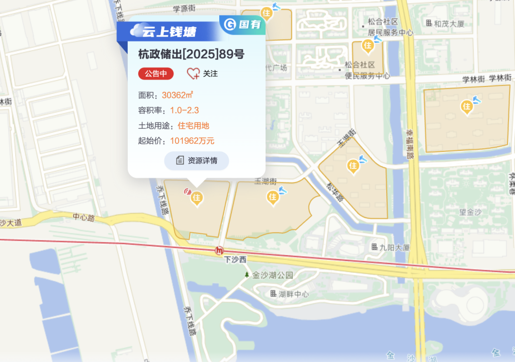 杭政储出[2025]89号地块为钱塘区下沙单元QT010102-32地块,地块东至松合路,南至金沙大道,西至乔下线,北至玉湖街。该地块的出让面积为25707平方米,出让建筑面积65643.1平方米,出让起始价为101962万元,折合起始楼面价为15533元/平方米。